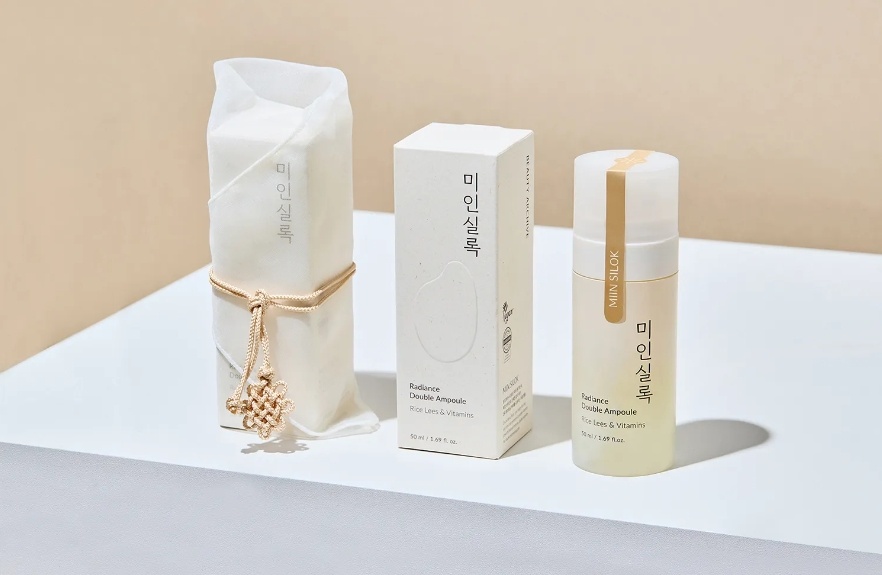 此外,MIIN SILOK的次級包裝則使用了閃光面料,這種材質靈感來源于提取米酒酒糟時使用的棉布。閃光面料不僅突出了品牌的核心成分,還賦予包裝一種奢華感。傳統的韓國結繩元素被巧妙地加入到包裝設計中,增加了品牌的獨特性和文化底蘊,進一步提升了消費者的品牌體驗。